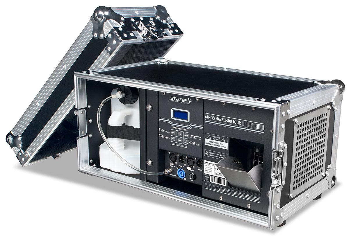 STAGE4 ATMOS HAZE 1400 TOUR. - Мощный генератор сценического тумана в туровом кейсе с функцией самоочистки, работающий на жидкости на водной основе. Нагревательный элемент - 1400Вт, встроенный вентилятор - 100Вт, ёмкость для жидкости - 5,6л, управление - DMX-512 / LCD панель на корпусе с таймером, регулировкой мощности и длительности интервалов и выбросов дыма, время нагрева - 60сек, производительность - 425м.