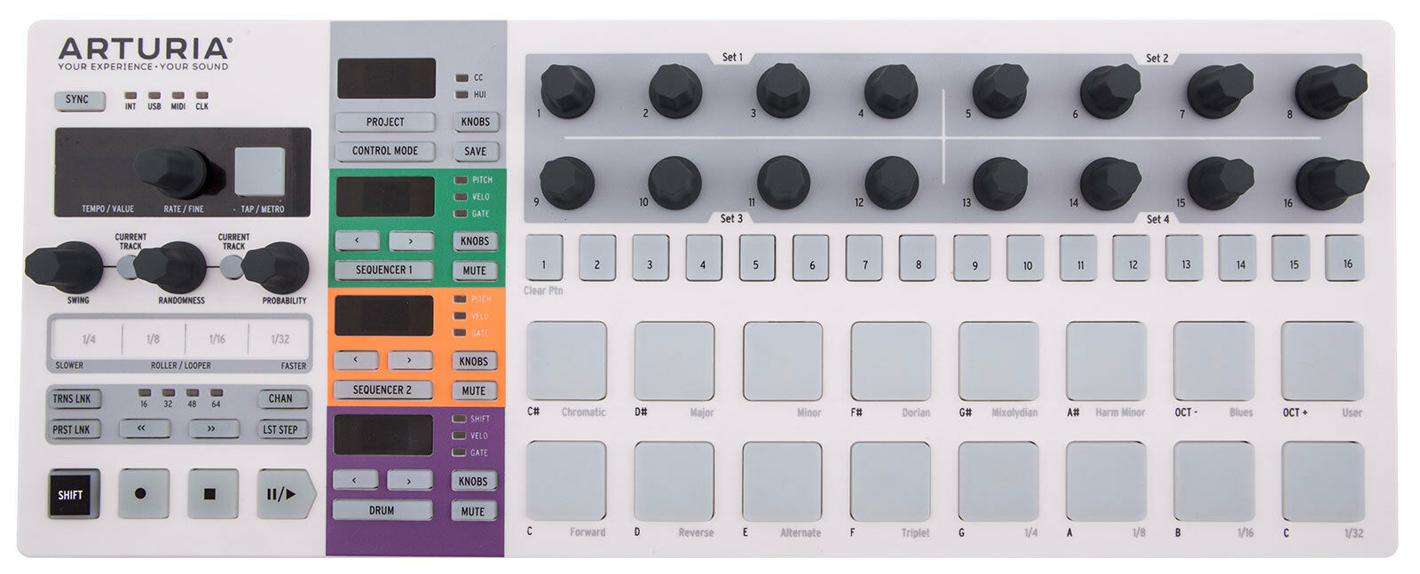 BeatStep Pro от компании Arturia представляет собой многофункциональный пад-контроллер, поддерживающий MIDI - стандарт цифровой звукозаписи. Данный контроллер сочетает в себе функционал управления DAW, а также возможности MIDI или CV-Gate секвенсора. В режиме секвенсора устройство поддерживает работу с 3-мя встроенными линиями: две мелодических и одна перкуссионная. Каждая из линий длиной не более 64 шагов может содержать паттерны в количестве до 32 штук. Секвенсор также позволяет осуществлять запись в реальном времени таких параметров, как velocity или note length. Arturia BeatStep Pro оснащен всеми необходимыми для профессиональной работы разъёмами. На задней панели располагается USB-вход, входные и выходные терминалы для CV/Gate в количестве 6 штук и MIDI разъемы. Специализированное программное обеспечение MIDI Control Center позволяет осуществлять регулировку всех необходимых параметров контроллера. Встроенная память поддерживает хранение проектов в количестве не более 16 штук.