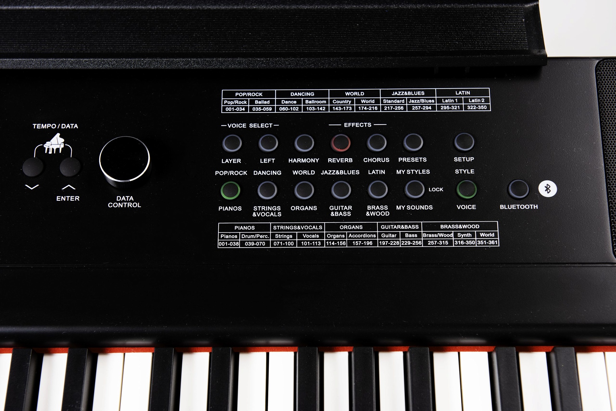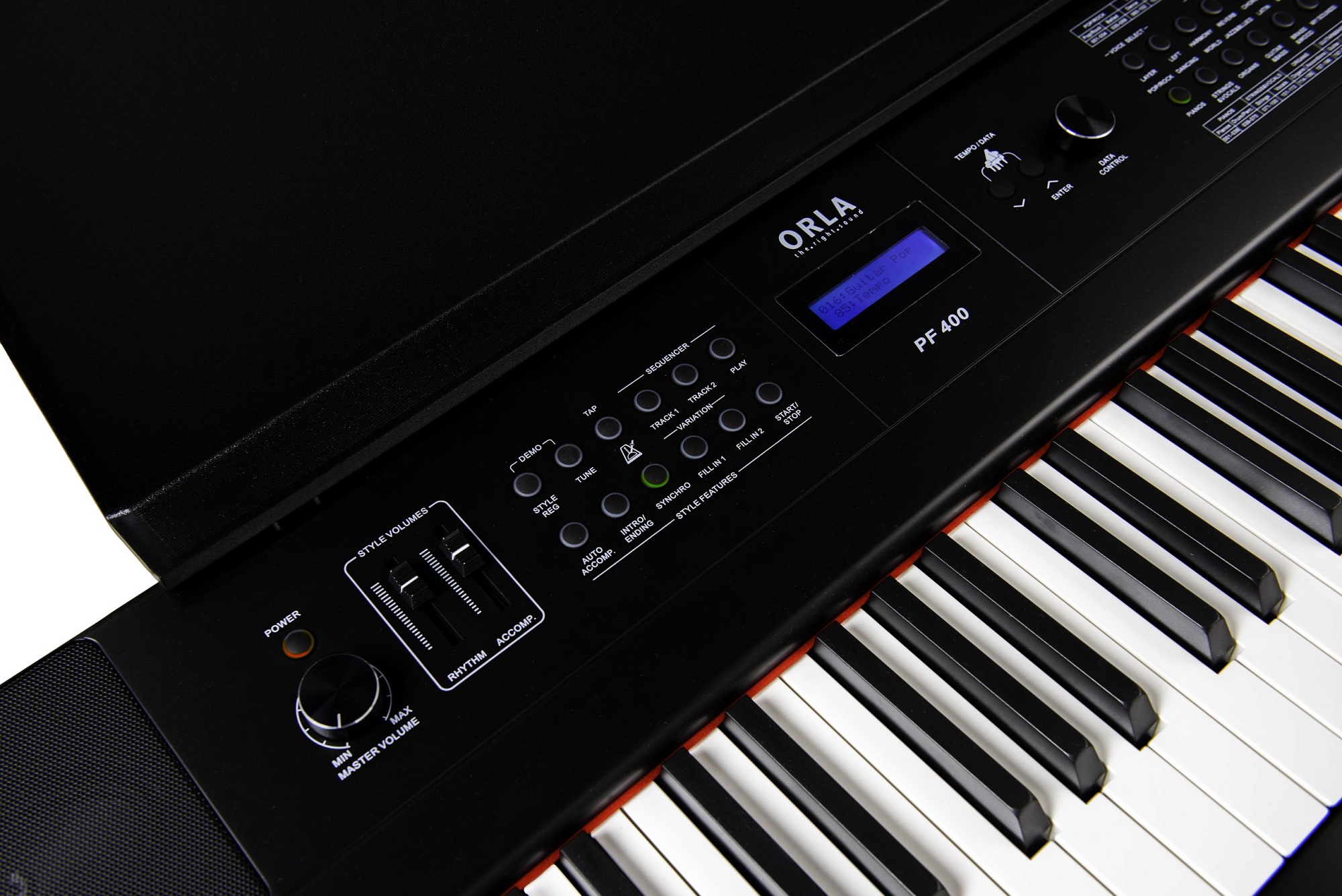 Стили: 350 стилей с автоматическим аккомпанементом, вступление, вставка 1, вставка 2, концовка, Tap Tempo, синхронизация. Регуляторы громкости. Регистрации в памяти, система аккордов для клавиатуры.