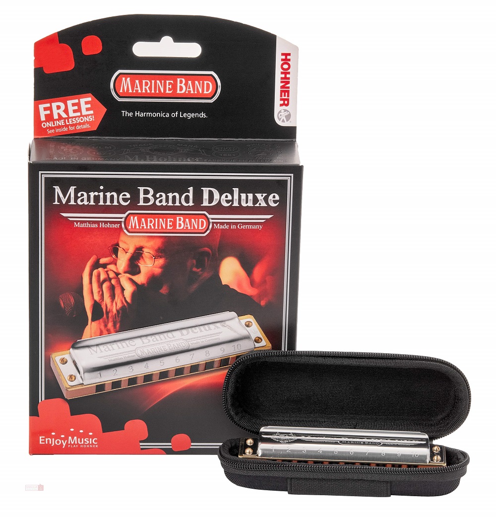 HOHNER Marine Band Deluxe B - это губная гармоника серии Marine Band. Тональность гармоники - B. Гармоника представляет модернизированную версию популярной, классической модели Marine Band 1896/20. В отличии от классической модели, корпус новой модели не покрыт краской. Корпус сделан из очень плотной древесины со специальным составом лака. Крышки открытого типа. Это придаёт звучанию гармоники дополнительный объем и силу. Платы зафиксированы к корпусу при помощи 3 винтов. Крепление крышек посредством 4 винтов. все эти нововведения дают звучанию инструмента дополнительную бархатистость и особую глубину.