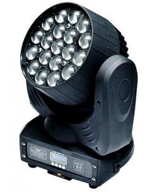 Поворотная "голова" WASH, 19 RGBW LED по 12Вт., 3-моторный линейный зум 6 ° - 50°, линейный диммер, электронный строб, система синтеза цвета RGBW 4 в 1, DMX-512 - 16 кан., Pan 540°; Tilt 265° (16 bit), 260 Вт, 100-240 В 50/60 Гц, вес: 9,2 кг, размеры: 325*188*396 мм.