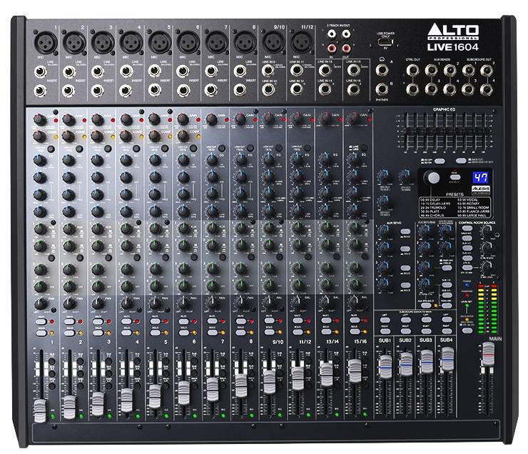 Alto LIVE 1604 - профессиональный 16-канальный, 4-bus микшер, оборудованный всем необходимым для создания идеального микса. С гибкими опциями маршрутизации и множеством встроенных DSP инструментов, Live 1604 подходит требованиям любого живого исполнения. Этот микшер характеризуется 10 сбалансированными XLR входами с переключаемым фантомным питанием, 3-полосным эквалайзером с параметрической серединой для дополнительного формирования тона, 4 aux посыла через канал для внешних эффектов и мониторинга и 9-полосным графическим эквалайзером для основных выходов. 60 мм фейдеры со светодиодной подсветкой предоставляют точное управление и визуальную связь для более аккуратной работы. Благодаря разнообразным опциям подключений, Live 1604 справится с любым событием от маленького кафе до большой сцены с концертом рок группы.