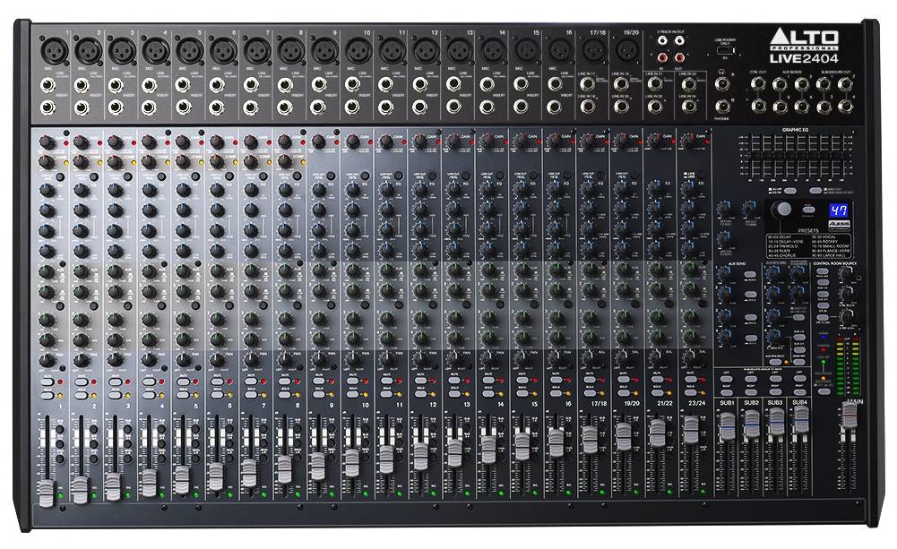 Alto LIVE 2404 - профессиональный 16-канальный, 4-bus микшер, оборудованный всем необходимым для создания идеального микса. С гибкими опциями маршрутизации и множеством встроенных DSP инструментов, Live2404 подходит требованиям любого живого исполнения. Этот микшер характеризуется 18 сбалансированными XLR входами с переключаемым фантомным питанием, 3-полосным эквалайзером с параметрической серединой для дополнительного формирования тона, 4 aux посыла через канал для внешних эффектов и мониторинга и 9-полосным графическим эквалайзером для основных выходов. 60 мм фейдеры со светодиодной подсветкой предоставляют точное управление и визуальную связь для более аккуратной работы. Благодаря разнообразным опциям подключений, Live 2404 справится с любым событием от маленького кафе до большой сцены с концертом рок группы.