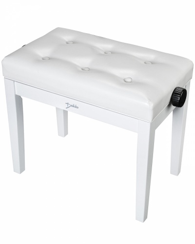 Банкетка для пианино или рояля деревянная, цвет - БЕЛЫЙ, покрытие - глянцевый лак, подъемный механизм регулировки высоты 48-58 см. с пластиковыми ручками, прямые конусообразные ножки с резиновыми наконечниками, материал сиденья - искусственная кожа с декоративными пуговицами, размер 32х56х57 см.