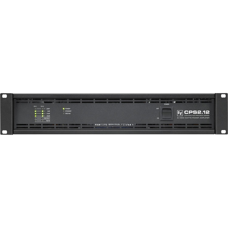 2-х канальный усилитель Electro-Voice CPS2.12 «AB»-класса на каждый канал выходит по 1800 Вт на 2 и 1200 Вт на 4 Ома, а на 8 Ом получается 750 Вт на канал. Кроме того имеется обрезной фильтр на 50 Гц, что позволяет избежать перенасыщения трансформатора громкоговорителя. В дополнение возможен режим работы по мостовой схеме, для увеличения выходной мощности. Сзади усилителя, на задней панели имеются входные аттенюаторы, входные и выходные разъёмы типа Phoenix и переключатель программирования задержки включения усилителя. Для удаленного контроля и управления с помощью программного обеспечения IRIS-Net в Electro-Voice CPS2.12-II имеется слот для подключения модуля RCM-810, который позволяет регулировать выходную мощность на нагрузке от 2 до 10 Ом с шагом в 0,1 Ом.