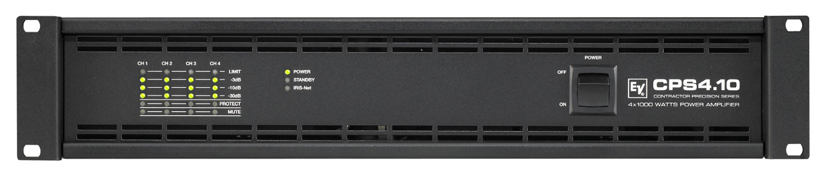 Electro-Voice CPS4.10 - это новый четырёх канальный усилитель от компании Electro Voice, насыщенный новаторскими идеями и технологиями. Усилитель надежно защищен от перегрева, перегрузок, короткого замыкания, чрезмерных высокочастотных сигналов и постоянного тока на выходе. Основной особенностью CPS 4.10, является возможность применения цифрового модуля управления RCM-810, позволяющего контролировать состояние громкоговорителей, программировать время задержки старта усилителя, оперативно регулировать уровни выходного сигнала, осуществлять дистанционное включение и отключение усилителя. Также, каждый канал усилителя может работать в индивидуальном режиме. Любой из каналов может быть переключен в режим 2 Ом, 4 Ом, 70 Вольт или 100 Вольт. При работе в Hi-Z режиме (70 или 100 Вольт), срабатывает 50 Hz high-pass фильтр, которой обеспечивает защиту трансформатора в громкоговорителе от насыщения. Кроме того, каналы усилителя могут работать в мостовом режиме, при этом получая двухканальный усилитель удвоенной мощности. Функция «мягкого» старта создаёт временную задержку между включением усилителя и активацией блоков усиления. Следующая цепь ограничивает ток при включении, не давая срабатывать предохранителям. На задней панели усилителя CPS 4.10 расположены входные и выходные коннекторы типа Phoenix и аттенюатор. Все настройки осуществляются с помощью программного обеспечения IRIS NET, позволяющего не только изменять, диагностировать и контролировать параметры CPS серии, но также объединять в единую сеть по шине CAN все устройства, имеющие данный интерфейс, производимые корпорацией EV Audio.