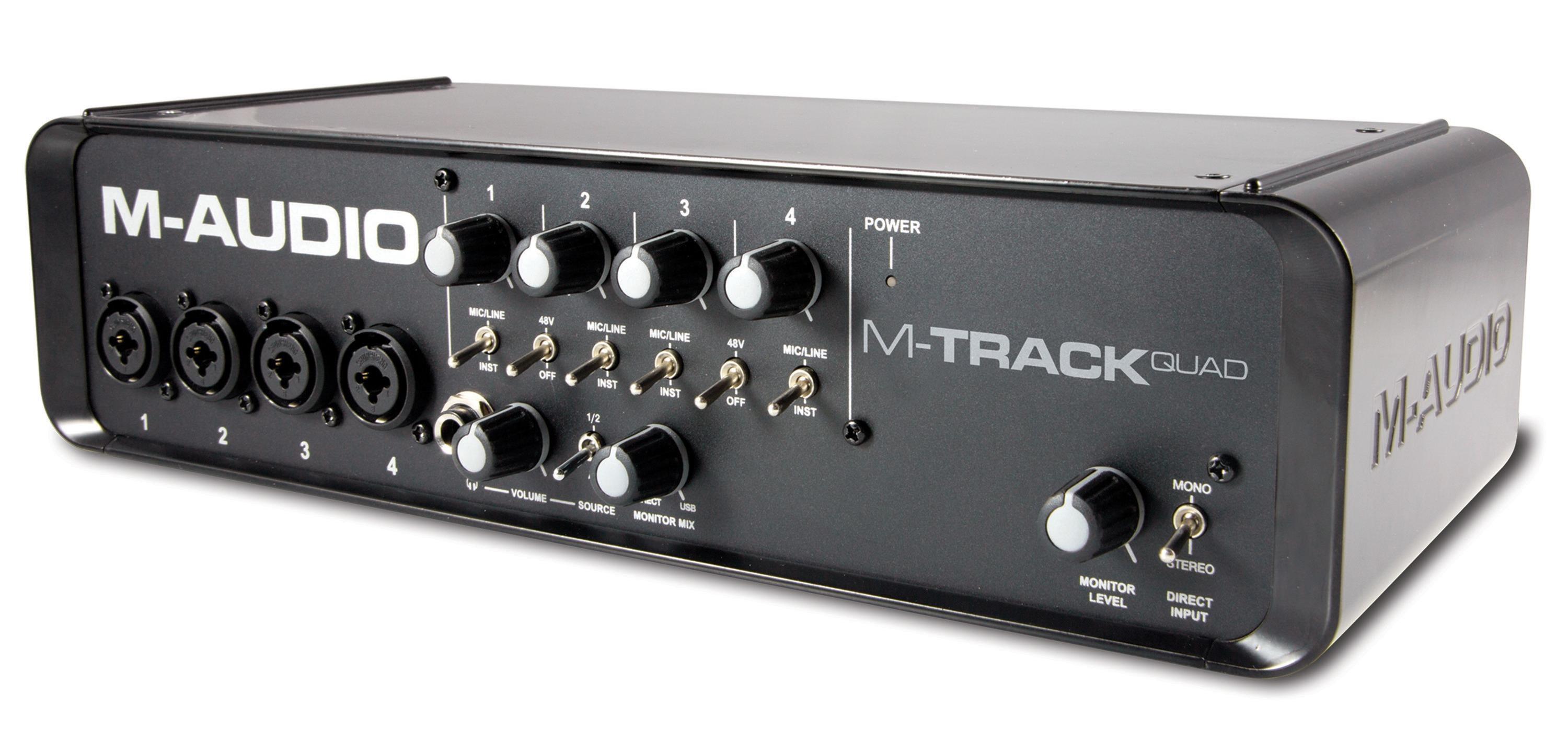 Флагман серии M-Track, M-Audio MTrack Quad предоставляет одновременно 4 аудиовхода. Как и в других интерфейсах семейства M-Track, the M-Track Quad снабжен 4 микрофонными предусилителями с индивидуальным переключателем 48В фантомного питания, 1/4" линейные входы с переключением сопротивления для гитар, и инсерты на каждый канал.