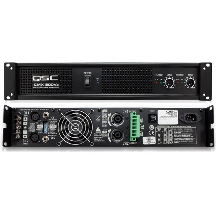 QSC CMX800Va – профессиональный двухканальный рэковый усилитель мощности класса H из серии CMX от компании QSC (высота – 2U). Он обеспечивает высокий уровень звука для профессиональных АС и может быть использован в турах, при озвучивании концертов, а также в постоянных и временных инсталляциях. Как правило, рекомендуется использовать усилитель с необходимой программной выходной мощностью или удвоенной номинальной RMS. Отличительные черты усилителя – возможность использовать трансляционное напряжение 70/100В (в том числе и в мостовых режимах), а также комплектная защитная крышка и набор DIP-переключателей на тыловой панели, с помощью которых можно легко выбрать режим работы или включить НЧ-фильтр.