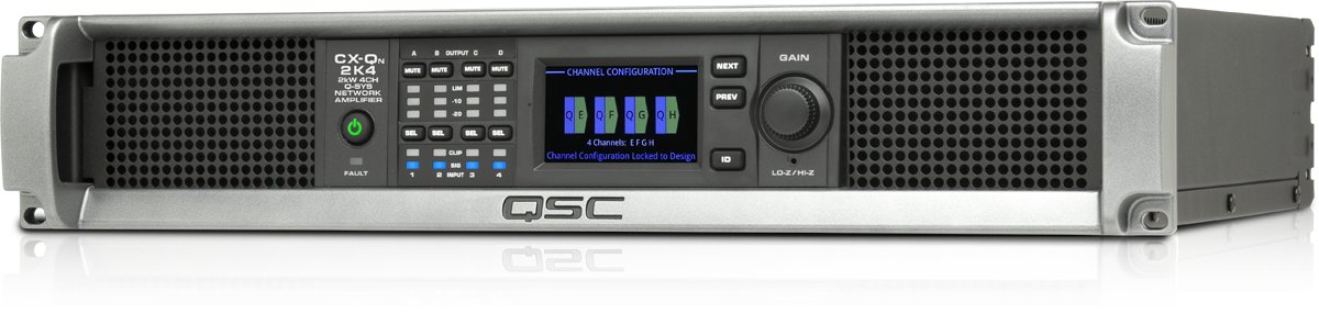 QSC CX-Qn 2K4 - усилитель мощности четырехканальный (2U), гибкое поканальное распределение номинальной мощности, суммарно до 2500 Вт, режимы bridged A+B/C+D, parallel AB/CD, parallel ABC, combined bridged/parallel AB+CD, parallel ABCD, независимый выбор типа выходной нагрузки каждого канала усилителя (4 Ом, 8 Ом, 70 В, 100 В), входы: только сетевые аудиопотоки через интерфейс Q-LAN, 8 x GPIO для удаленного управления, выход: 8-pin разъем Euro Phoenix (зеленый), класс D, защита выходных каскадов, 10.4 кг, Q-LAN интерфейс. Работает только с системой Q-SYS