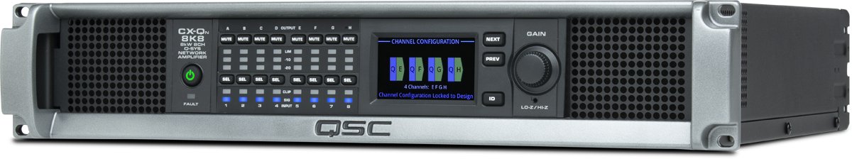 QSC CX-Qn 8K8 - усилитель мощности восьмиканальный (2U), гибкое поканальное распределение номинальной мощности, суммарно до 8000 Вт, режимы bridged A+B/C+D/E+F/G+H, parallel AB/CD/EF/GH, parallel ABC/EFG, combined bridged/parallel AB+CD и EF+GH, parallel ABCD/EFGH, независимый выбор типа выходной нагрузки каждого канала усилителя (4 Ом, 8 Ом, 70 В, 100 В), входы: только сетевые аудиопотоки через интерфейс Q-LAN, 8 x GPIO для удаленного управления, выход: 8-pin разъем Euro Phoenix (зеленый), класс D, защита выходных каскадов, 11.8 кг, Q-LAN интерфейс. Работает только с системой Q-SYS.