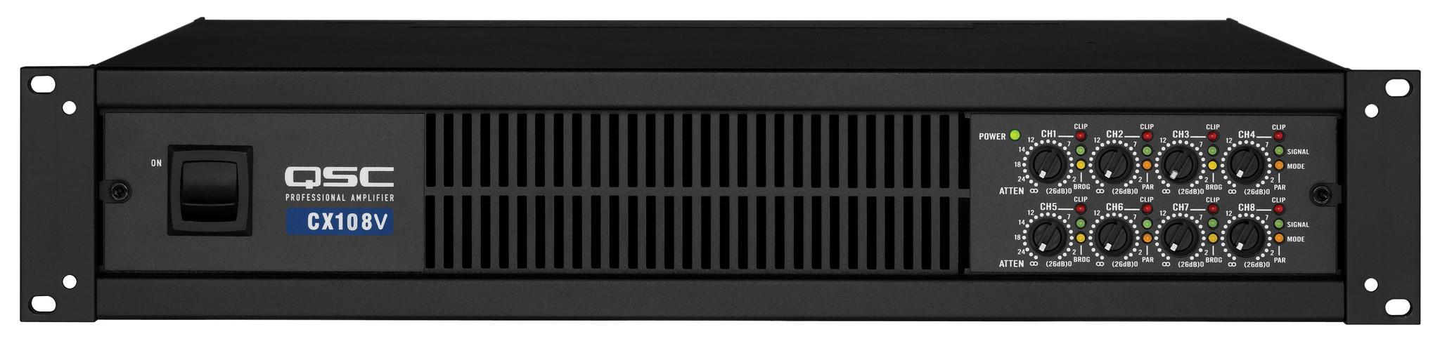 QSC CX108V – это профессиональный восьмиканальный рэковый усилитель мощности класса AB+B из серии СХ от компании QSC (высота – 2U). Он обеспечивает высокий уровень звука для профессиональных АС и может быть использован в турах, при озвучивании концертов, а также в постоянных и временных инсталляциях. Как правило, рекомендуется использовать усилитель с необходимой программной выходной мощностью или удвоенной номинальной RMS.
