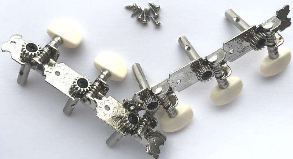 Колки на планке для акустической гитары Rocket ПA-70 межосевое растояние 70 мм, 2 планки по три колковых механизма, материал - хромированный метал с инкрустацией, пластиковый барашек овальной формы