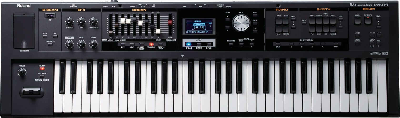Roland VR-09 удобен в дороге, доступен по цене и содержит лучшие звуки Roland. Это идеальное решение все-в-одном для выступающих клавишников. Специализированные звуковые генераторы для производства звука фортепиано, органа и синтезатора организованы на панели в три отдельных блока. Это дает мгновенный доступ к любым востребованным звукам. Мощные реалтайм-контроллеры дают максимум выразительности на сцене. 9 слайдеров позволяют сформировать тон, а большой набор кнопок и ручек позволяют отстроить параметры семи эффектов, работающих одновременно. Другой замечательной возможностью является встроенный лупер, а также секция барабанов для занятий и джема. V-Combo VR-09 с гибким набором звуков и удобством управления - это воплощение мечты выступающих музыкантов.