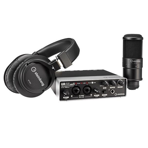 Бюджетный комплект для звукозаписи STEINBERG UR22MKII Recording PACK. В состав набора входят следующие компоненты: 2-канальный звуковой USB-интерфейс UR22 mkII, полноразмерные динамические наушники ST-H01 и конденсаторный микрофон ST-M01. К ним прилагается пакет программного обеспечения, включающий Cubase AI, WaveLab LE и Cubasis LE.