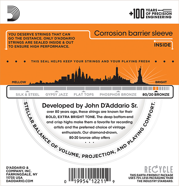 80/20 сплав бронзы, который часто называют латунь, это оригинальный сплав для струн акустической гитары, разработанный John D'Addario Sr. и John D'Angelico в 1930 году. Струны из сплава бронзы 80/20 популярны для игры благодаря их четкому, глубокому звучанию и привлекают множество классических и винтажных исполнителей за традиционный звук. Все струны D'Addario для акустических гитар имеют в основе шестигранную проволоку из высокоуглеродистой стали, что в результате дает яркий, продолжительный звук с прекрасной интонацией.