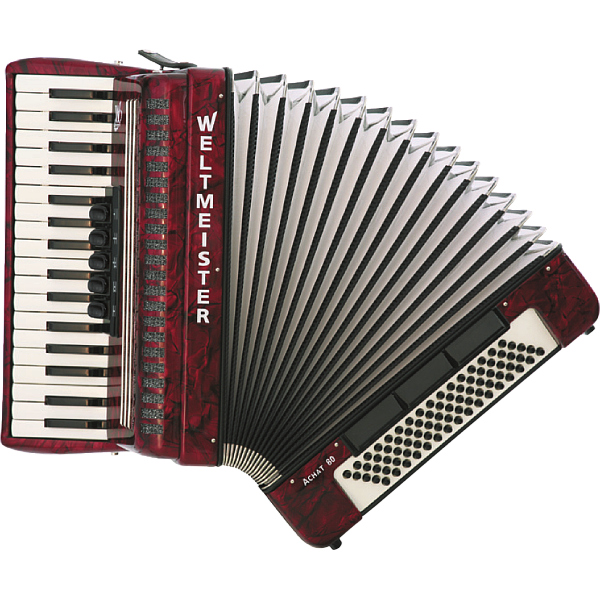 Weltmeister Achat 34/80/III/5/3  отличается от Achat 72 басовой стороной и не имеет 6-того ряда (уменьшенных саптаккордов). Achat 80 является популярным и востребованным аккордеоном как у начинающих, так и у продвинутых музыкантов. Эта модель характеризуется неприхотливостью, абсолютной надежностью и высоким качеством звука. Его возможностей вполне достаточно для исполнения большинства классических произведений и популярной музыки. Вес инструмента 7,8 кг. Ремни и футляр в комплекте.