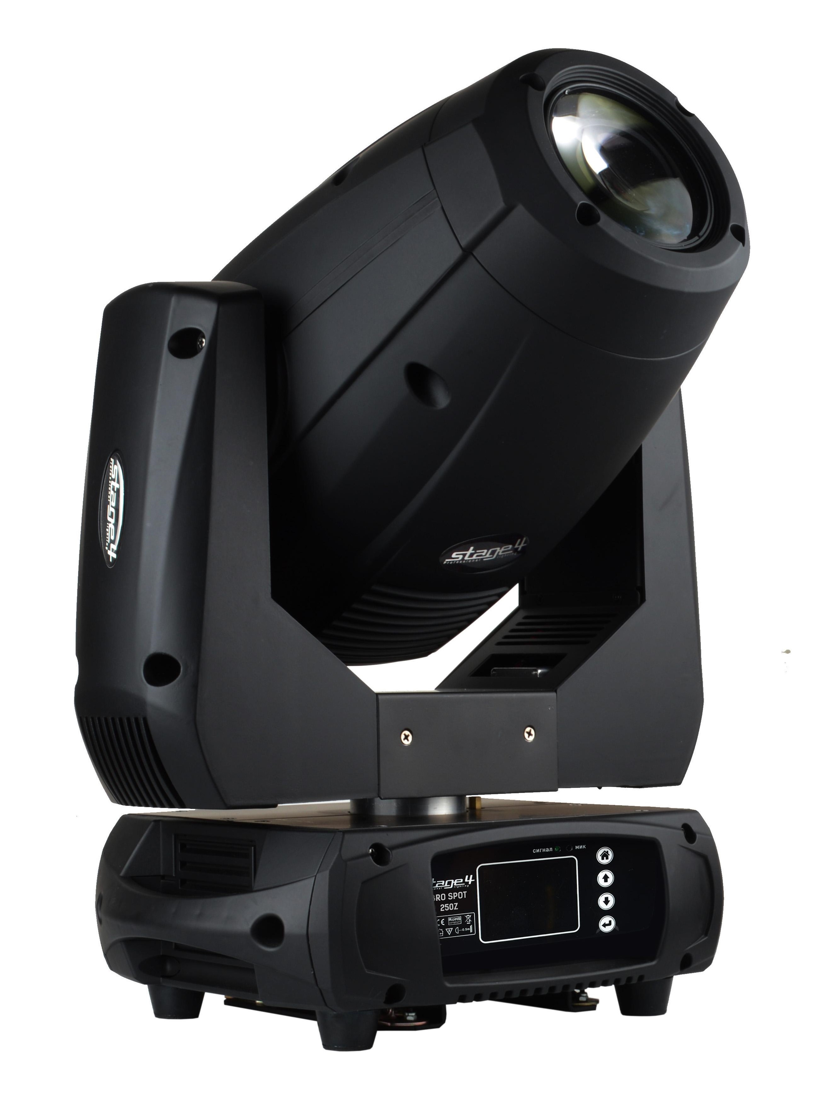 STAGE4 broSPOT 250Z - Поворотная "голова" типа SPOT-BEAM / LED 250 Вт./ Зум 12-48° / 3-гранная призма с регулируемой скоростью и направлением вращения / Фокус от 2,5м.до 15 м. / Линейный диммер 0-100% / Фрост-фильтр / Цветовое колесо 7 цветов+белый / Колесо статичных гобо (8 гобо + открытое) / Колесо вращающихся гобо (6 гобо + открытое).