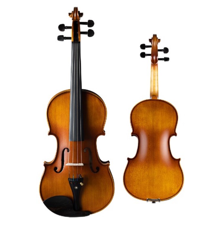 Верхняя дека: массив ели. Задняя дека и обечайка: массив клена. Подставка: клен. Струнодержатель с одной машинкой. Накладка грифа, струнодержатель, колки, подбородник: черное дерево. В комплекте футляр, смычок, канифоль. Размер: 4/4.