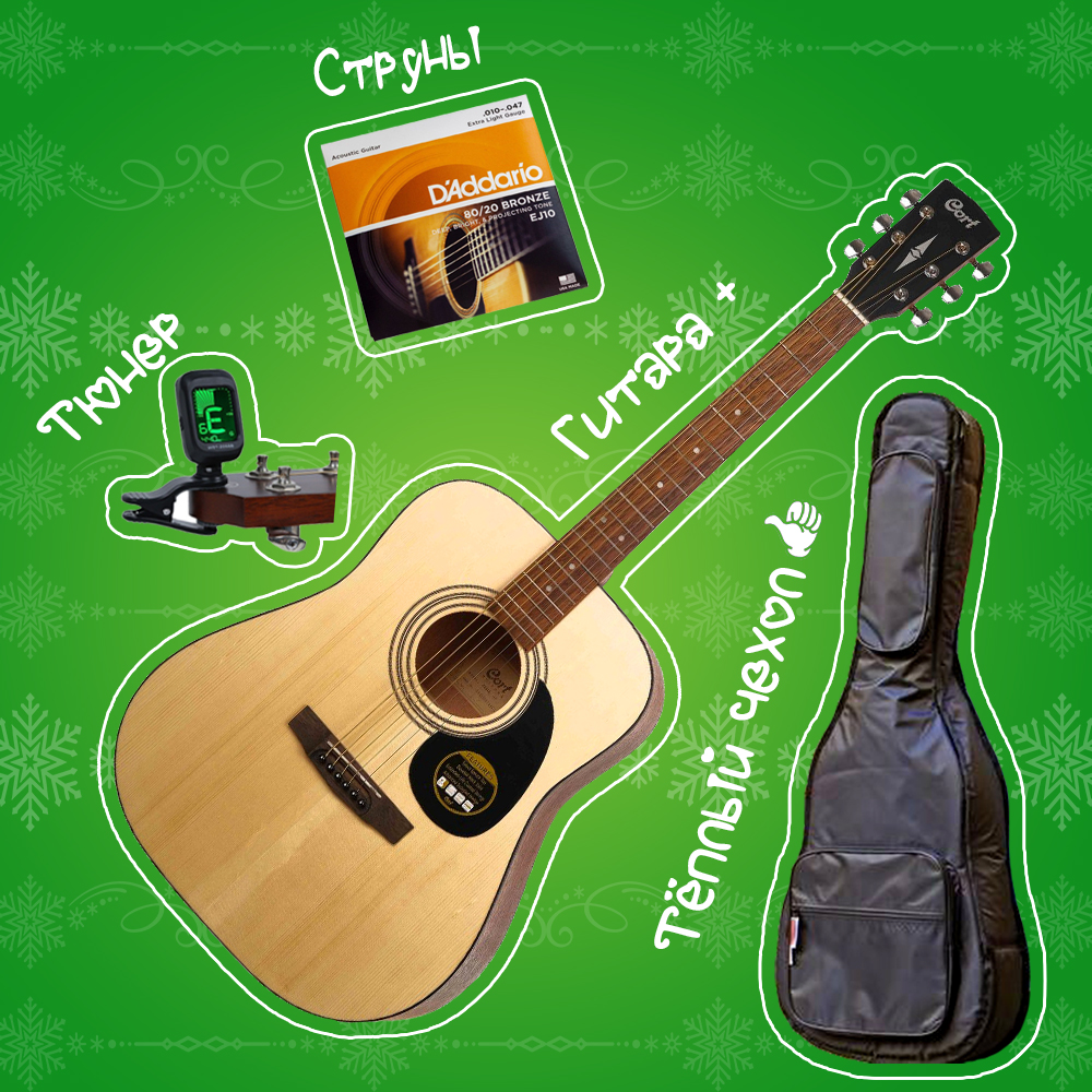 Новогодний комплект: акустическая гитара, утепленный чехол, тюнер для настройки гитары, качественные струны D'Addario (калибр на выбор 9-10-11)