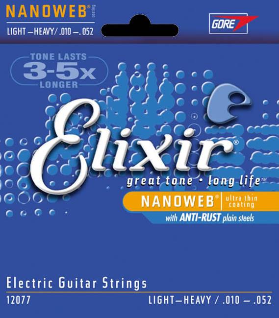 Elixir 12077 NANOWEB - Комплект струн для электрогитары, Light, 10-52. Яркий звук струн без покрытия. Покрытие Gore NanoWeb дает более яркий звук, чем у предыдущих моделей, при этом обеспечивая быстрое действие, благодаря ультратонкому сплаву.