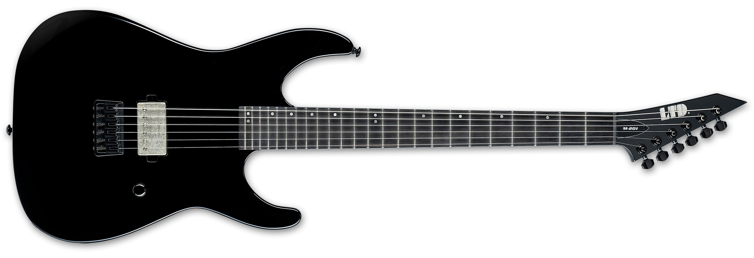 LTD M‑201 Baritone HT — 6‑струнная баритон-гитара с 27″ (685–686 мм) мензурой в чёрном глянцевом финише. Корпус — махагони, гриф — трёхсекционный клен ‘Thin U’, накладка — розовое дерево с 24 X‑Jumbo ладами. Оснащена одним хамбакером ESP LH‑150B с coil-split (push–pull), фиксированным тремоло-бриджем и LTD колками.