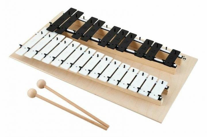 Металлофон детский GOLDON 11070 хроматический, 20 нот, диапазон C6-G7, металлические пластины черного и белого цветов на деревянной раме, 2 палочки в комплекте, подарочная упаковка