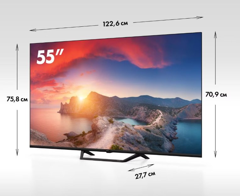 Широкоформатный Led экран диагональю 55 дюймов обеспечивает вывод изображений разрешением 4К UHD. Технология квантовых точек контролирует цветовой спектр, предлагает к обзору контрастную и насыщенную картинку, хорошо видимую при любом внешнем освещении.• Безрамочный дизайн