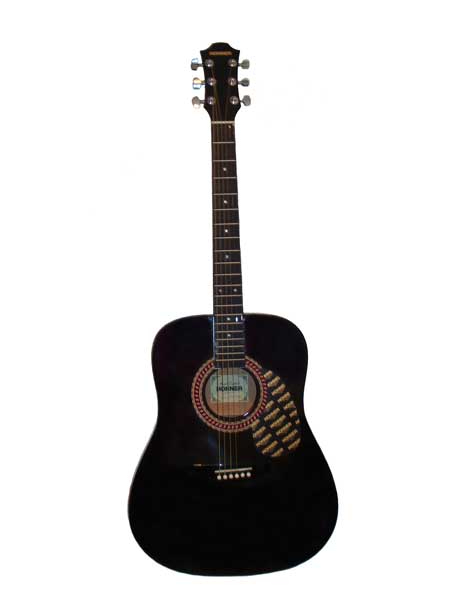 Полноразмерная акустическая гитара. Верхняя дека - Ель, Нижняя дека - Красное дерево, Обечайка - Красное дерево, Гриф - Красное дерево с накладкой из палисандра, Механика - Хромированная, Цвет - черный.