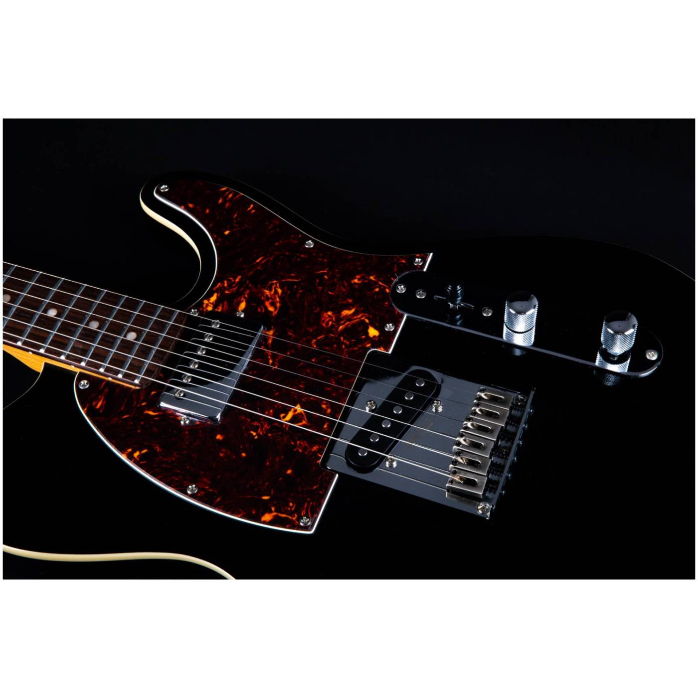Гриф выполнен из печеного клена (roasted maple). При такой обработке поры дерева максимально сжимаются и в процессе использования вода уже не будет выходить, гриф не сожмется и лады не повылазят вне зависимости от влажности и смены температуры. Плюс такое дерево выглядит очень красиво. Накладка на гриф выполнена из палисандра. Конфигурация звукоснимателей у модели JET JT-350 BK R - SH Alnico.