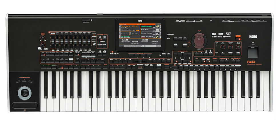 KORG Pa4X-61 - многофункциональная аранжировочная станция. Korg Pa4X-61 – это профессиональная аранжировочная станция из серии PA, которая включает в себя инструменты с огромным функционалом, разработанные для саунд-продюсеров, аранжировщиков, композиторов, диджеев и активно выступающих музыкантов. Модель содержит в себе множество классических, этнических и современных электронных тембров, большое количество различных стилей для исполнения музыки в любых жанрах, а также многофункциональный интерфейс, позволяющий контролировать практически любой параметр. Всего в памяти прибора находятся более 1900 предустановленных тембров (512 пользовательских), 110 наборов ударных (256 пользовательских) и больше 550 стилей. Высококачественное звучание каждого инструмента достигается благодаря мощному звуковому генератору EDS-X, который обеспечивает полифонию до 128 голосов. Для исполнения партий присутствует полувзешенная клавиатура с 61 полноразмерной клавишей, оборудованной чувствительностью к силе касания и функцией Aftertouch (послекасания), которая обеспечивает аутентичный отклик клавиш при нажатии. Для создания полноценного формата фортепиано можно подключить педаль сустейна или экспрессии, входы для них сделаны на разъемах 1/4'' Jack TRS. Отдельно можно приобрести следующие устройства: педали XVP-10, DS-1H и VOX V860, футсвитчи PS-1 и PS-3, контролеры EXP-2 и EC-5. Основным элементом управления является 7-дюймовый сенсорный дисплей, с помощью которого можно переключать банки звуков, редактировать все параметры и управлять режимом KAOSS. Этот режим сделан по подобию популярного синтезатора Korg KAOSSILATOR и позволяет манипулировать множеством эффектов всего лишь одним нажатием на экран. Дисплей оборудован технологией TFT, благодаря которой достигается яркое и четкое изображение, а также широкий угол обзора. Помимо этого, его можно наклонять вперед для еще большего удобства. На корпусе также располагается большое количество физических органов управления: кнопки, регуляторы, подвижный джойстик, отвечающий за несколько параметров сразу, и 8 фейдеров, выполняющих роль микшера. В наличии имеется 3 блока мультэффектов в сумме дающие 148 типов реверберации, модуляции, задержки и других эффектов. Одновременно можно включать только 2 из них. Присутствует блок эффектов для мастеринга от Waves Audio, включающий в себя такие программы, как MaxxEQ, MaxxBass, MaxxTreble, MaxxStereo и MaxxVolume. Также есть вокальный процессор TC Helicon, содержащий гармонайзер, даблер, корректор высоты тона и многое другое. Korg Pa4X позволяет загружать пользовательские сэмплы и производить запись аудио на флэш-карту, для которой есть два порта USB-A. Можно подключить и SD-карту в соответствующий слот на задней панели. Форматы загрузки сэмплов: KORG, Wav, AIFF и SoundFont. Запись производится в формате MP3. Также можно загружать аудио в таких аудио-форматах, как MID, KAR, MP3+Lyrics и MP3+G. Текст, содержащийся в файлах для караоке, можно воспроизводить на внешнем мониторе, для которого есть выход на разъеме RCA. Порт USB-B предназначен для подключения к компьютеру, а также в наличии имеется полноценный MIDI-интерфейс с входом, выходом и сквозным выходом Thru на стандартных 5-контактных разъемах. Есть вход для гитары или микрофона на разъеме Combo Jack/XLR с собственным регулятором входного уровня и функцией включения фантомного питания, необходимого большинству конденсаторных микро