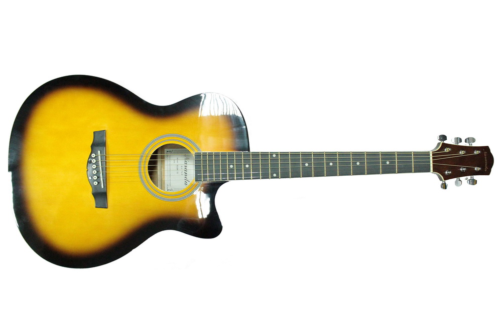 Акустическая гитара с вырезом. 40", верхняя дека - американская липа, задняя дека - американская липа, гриф 43мм - красное дерево, накладка грифа - клен, бридж - палисандр, мензура 650мм, колковая механика - закрытая хромированная, цвет - желтый санберст.