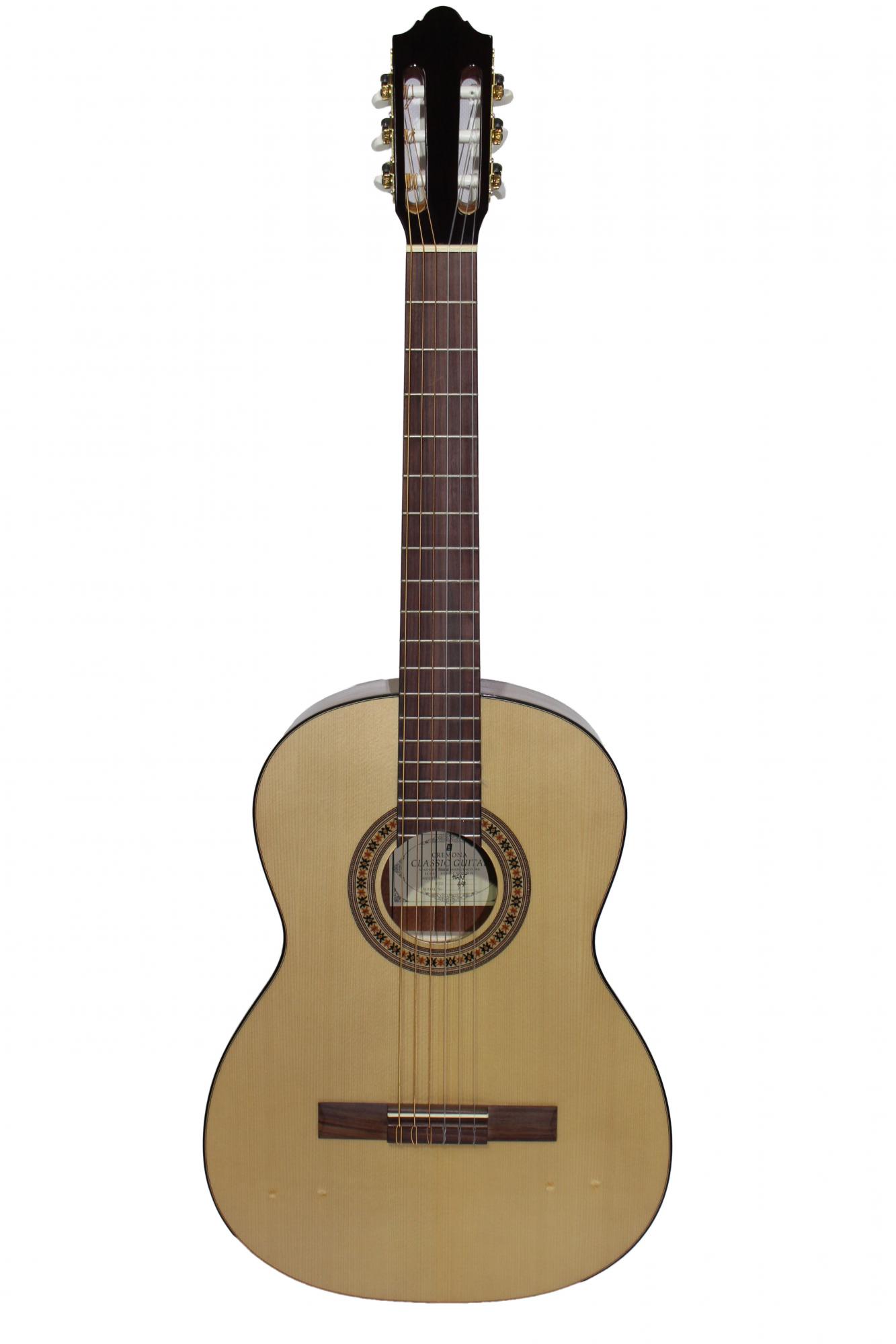 Верхняя дека: шпон ели. Нижняя дека и обечайки: шпон махагони. Гриф: махагони. Накладка грифа и бридж: амазаку (овангкол). Колковая механика с покрытием латунью. Деревянная окантовка. Нейлоновые струны. Цвет натуральный. Глянцевое покрытие. Размер 4/4.