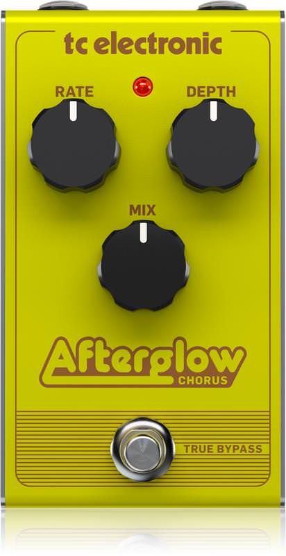TC ELECTRONIC AFTERGLOW CHORUS - гитарная педаль, эффект хорус, модель в винтажном стиле с легендарной полностью аналоговой электронной схемой BBD (Bucket Brigade Delay). Создатели этой педали ориентировались на тембры модуляции, характерные для золотой эпохи рок-н-ролла. С помощью AFTERGLOW CHORUS можно получить разнообразие звуков, отправившись в настоящее путешествие во времени: от динамика Лесли, характерного для 60-х и 70-х до гранжа. Звучание, получаемое при использовании педали AFTERGLOW CHORUS, – богатое и насыщенное, обладающее объемом, оставляющим ощущение настоящей трехмерности. Управление осуществляется с помощью трех регуляторов: Rate (настраивает скорость модуляции), Depth (настраивает интенсивность эффекта) и Mix (регулирует соотношение исходного сигнала и обработанного). Режим True Bypass гарантирует, что эффект не влияет на звук инструмента, когда не используется. Педаль заключена в прочный цельнометаллический корпус «Built-like-a-tank» яркого желтого цвета, способный выдержать не самое бережное обращение в турах. Электропитание – от батарейки «Крона» 9 вольт или сетевого адаптера TC Electronic Powerplug 9 (приобретается отдельно).