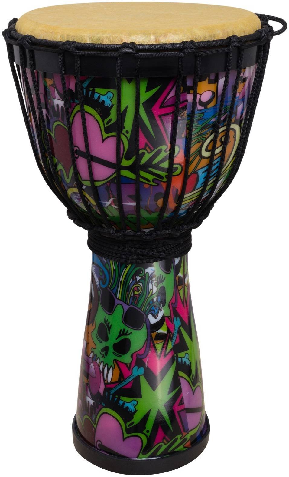 TERRIS DPR-08 Black - Джембе размера 08" х 16" из пластика с синтетической мембраной и ярким дизайном, навеянным HIP-HOP культурой. Модель TERRIS DPR-08 Black также декорирована плетенными нитями, имитирующими веревочную настройку. Пластиковый корпус делает барабан невероятно легким, что отвечает современным тенденциям к мобильности