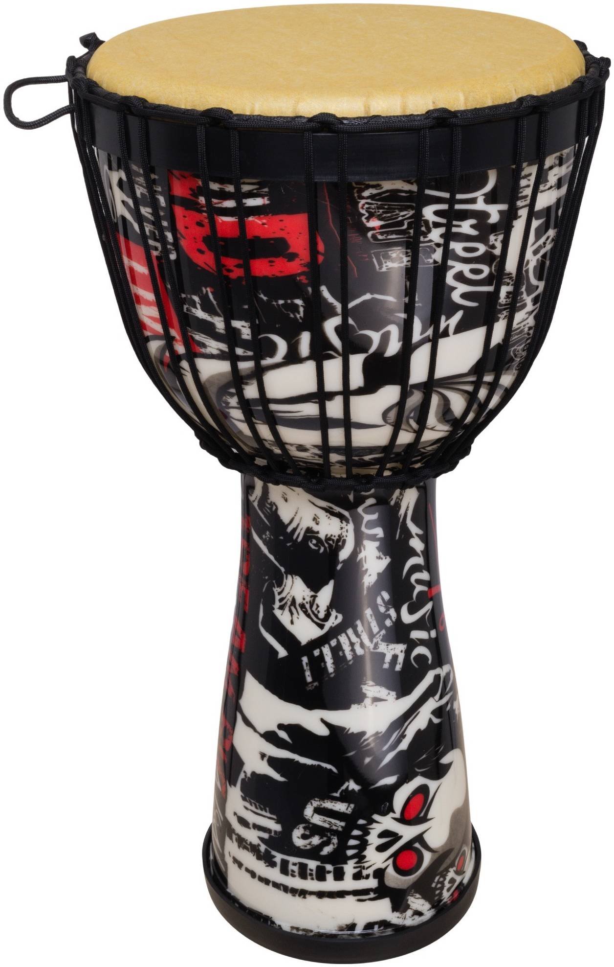 TERRIS DPR-10 Black - Джембе размера 10" х 20" из пластика с синтетической мембраной с ярким дизайном, навеянным HIP-HOP культурой. Модель TERRIS DPR-08 Black также украшена декором из плетенных нитей. Пластиковый корпус делает барабан невероятно легким, что отвечает современным тенденциям к мобильности