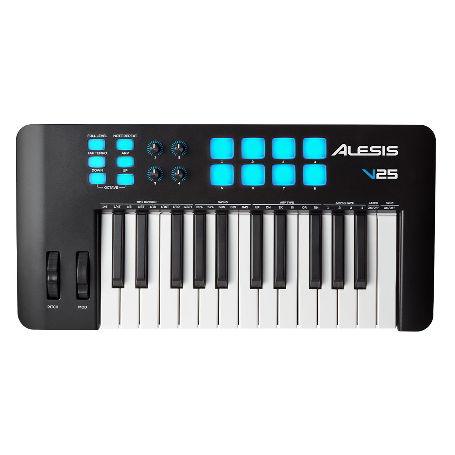 Alesis V25 – это мощный и интуитивно понятный MIDI-контроллер, который позволит вам управлять своим музыкальным программным обеспечением множеством регуляторов, кнопок и пэдов. С помощью 25 полноразмерных клавиш с чувствительностью к скорости нажатия и регуляторам октавы, вы сможете расширить вашу клавиатуру до полного музыкального диапазона и играть басовую линию, аккорды и мелодии. V25 также снабжена четырьмя назначаемыми кнопками и регуляторами для управления плагинами эффектов и виртуальными инструментами: вы может открывать и закрывать фильтры, настраивать уровни громкости, активировать эффекты, настраивать параметры под себя и многое другое. Восемь пэдов, чувствительных к скорости нажатия позволят запускать клипы и играть барабанные партии пальцами с необычайной отдачей, а колесики регулировки высоты тона и модуляции добавятся выразительности вашему выступлению.