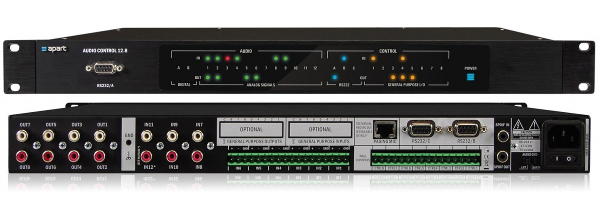 APart AUDIOCONTROL12.8 - это цифровой матричный коммутатор, разработанный на базе фиксированной DSP-архитектуры, позволяющий построить многоканальную систему озвучивания с настраиваемой маршрутизацией, возможностью дистанционного управления системой, обработкой всех аудио потоков, возможностью интеграции с системой оповещения и широкими возможностями по конфигурированию системы.