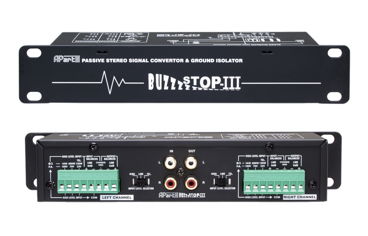 APart BUZZSTOP-MKIII - универсальный преобразователь аудио-сигналов. Позволяет конвертировать 100-вольтовый аудио-сигнал в балансный (симметричный) или небалансный (несимметричный) сигнал линейного уровня. APart BUZZSTOP-MKIII также позволяет преобразовать небалансный сигнал в балансный и наоборот. APart BuzzStop-MKIII может использоваться как изолирующий трансформатор для предотвращения шумов и помех при возникновении "земляной петли".