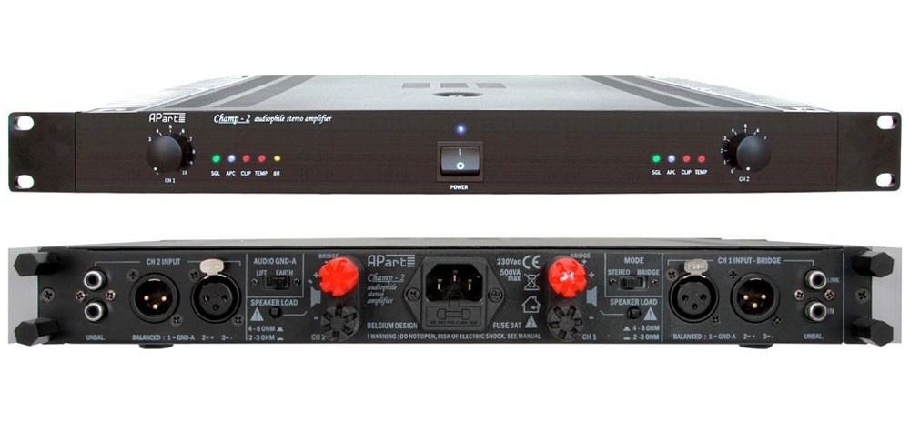 APart CHAMP-2 - Высококачественный усилитель мощности, 8 Ом - 2 х 200 Вт, 4 Ом - 2 х 350 Вт, 2.7 Ом - 2 х 450 Вт, мостовой режим 8 Ом - 750 Вт. Усилитель с конвекционным охлаждением, 2 массивных радиатора обеспечивают надежное охлаждение без использования вентиляторов. Выходной каскад усилителя высоковольтный класса G, высокий выходной ток, мощный тороидальный трансформатор блока питания, высококачественная элементная база.