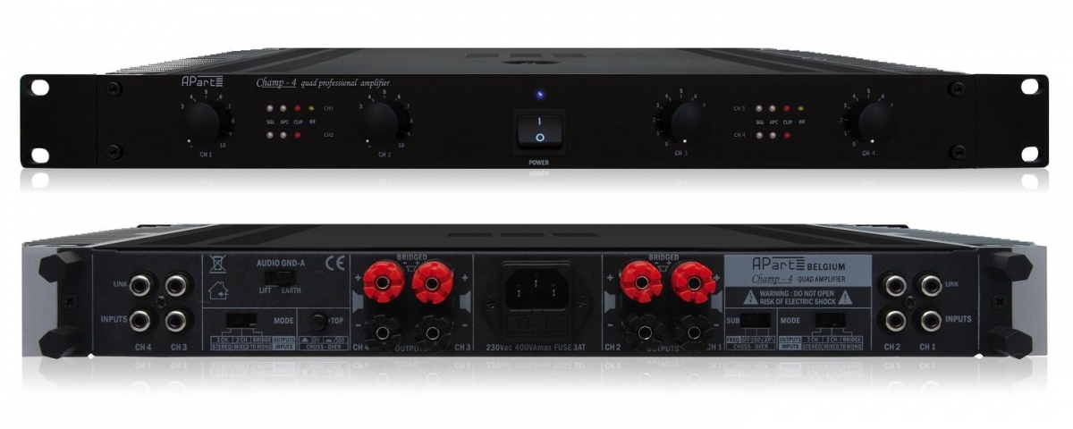 APart CHAMP-4 - четырехканальный усилитель мощности с конвекционным охлаждением. Корпус рэкового исполнения высотой 1U оборудован массивными радиаторами, что позволяет обеспечить достаточное охлаждение без использования вентиляторов даже в пиковых режимах работы усилителя. APart CHAMP-4 оборудован встроенными фильтрами нижних и верхних частот для подключения пассивных сабвуферов. Во всех усилителях серии CHAMP используется уникальная система защиты APC. Система APC обеспечивает защиту от экстремальной перегрузки, короткого замыкания, постоянной составляющей напряжения и перегрева. Но главной особенностью этой системы является возможность снижения уровня входного сигнала в определенных пределах при перегрузке по входу, не задействуя при этом лимитер. Таким образом система APC предотвращает работу лимитера и, соответственно, позволяет избежать искажений вносимых лимитером. Усилитель позволяет подключать нагрузку до 4 Ом в четырехканальном/стерео режиме. В мостовом режиме минимальный импеданс нагрузки составляет 8 Ом. Для использования в домашней стерео системе имеется возможность снять "ушки" для крепления в рэковую стойку.