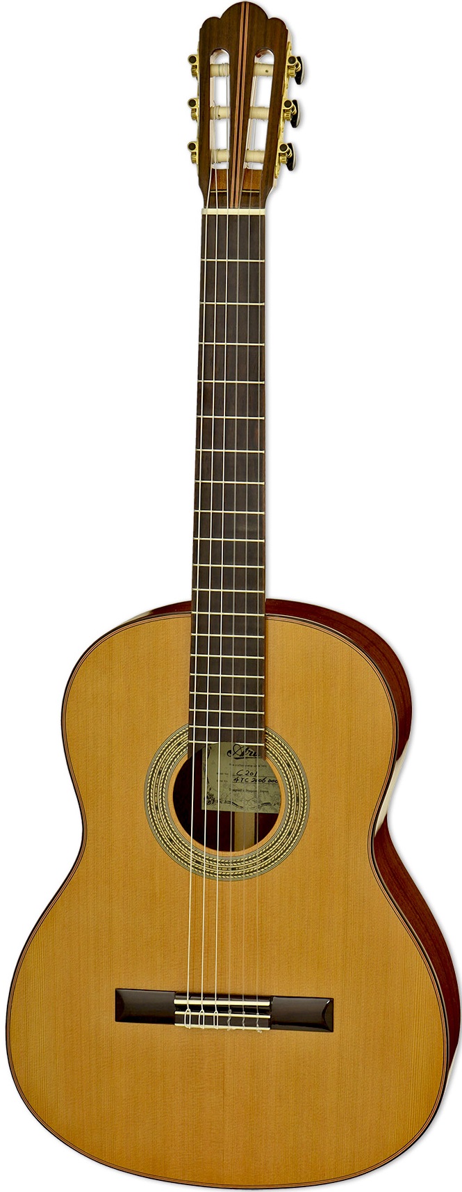 ARIA C201 - это классическая шестиструнная полноразмерная гитара серии El Clasico, изготовленная по традиционной испанской технологии. Верхняя дека выполнена из массива кедра, нижняя дека и обечайка из красного дерева. Гриф гитары изготовлен из красного дерева с накладкой из палисандра.
