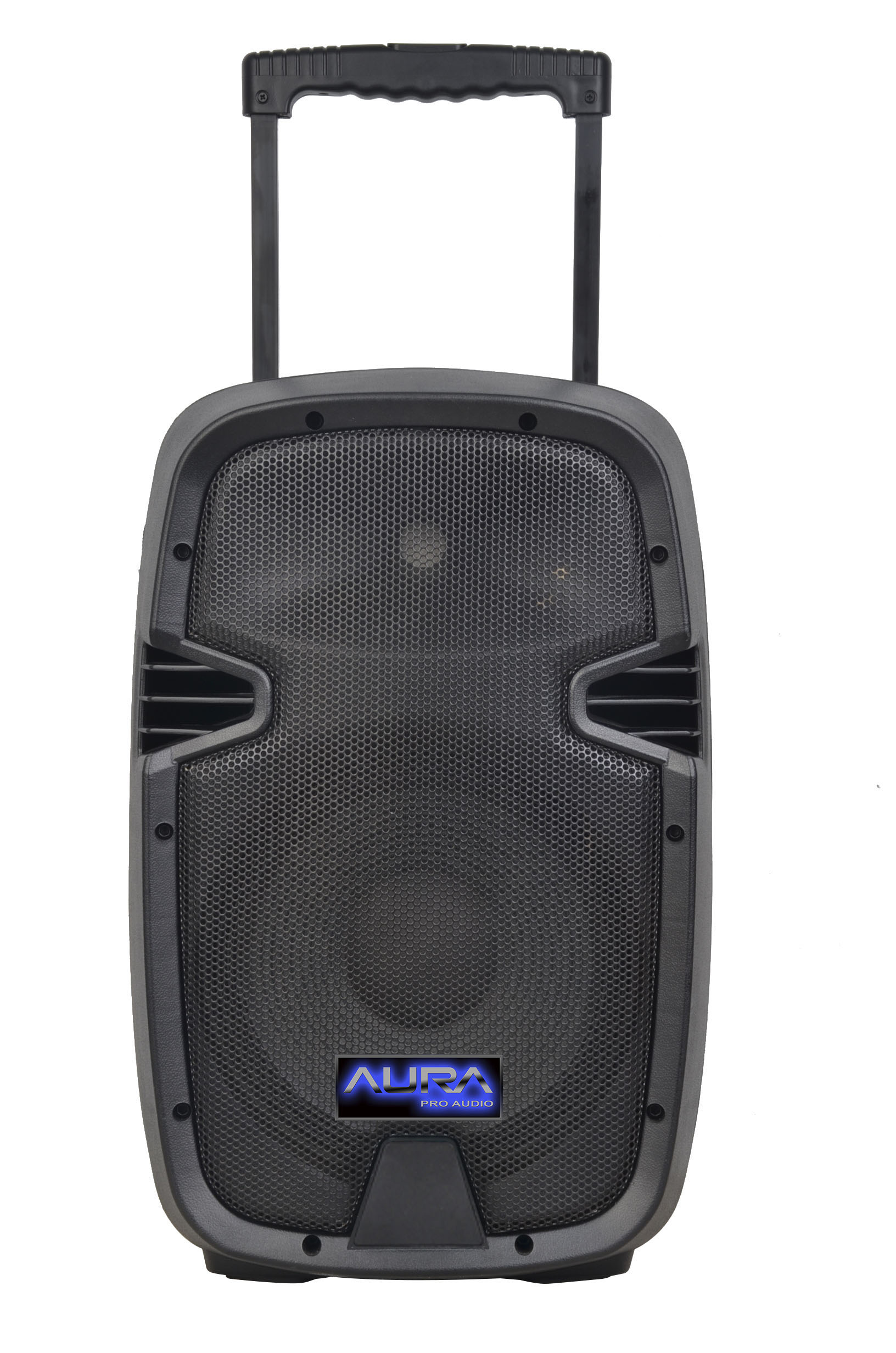 AURA A210MP3-Battery - портативное автономное устройство, мощностью 80 Вт, которое способно работать от аккумулятора (12В, 2.1A). Акустическая система имеет встроенную UHF радиосистему и один радиомикрофон в комплекте. Колонка так же имеет разъем SD-карты, bluetooth, USB-разъем и даже FM-радио. Для удобства транспортировки устройство снабжено колесиками и выдвижной ручкой. Кроме того, устройство можно закрепить на стандартной акустической стойке.