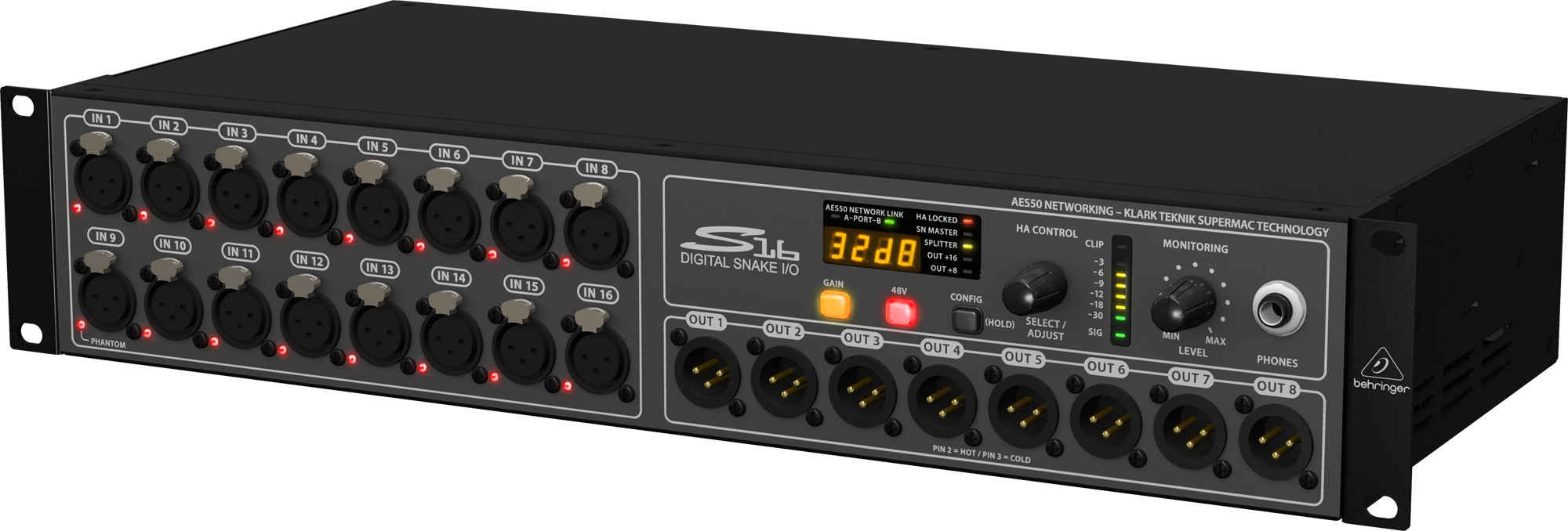 Behringer S16 - Коммутационный блок для цифровых микшеров Behringer X16 и X32, 16 микрофонных/линейных входов, восемь аналоговых выходов, интерфейс AES50, выход для наушников, два оптических цифровых выхода формата ADAT, MIDI-вход и выход, порт USB для модернизации операционной системы.