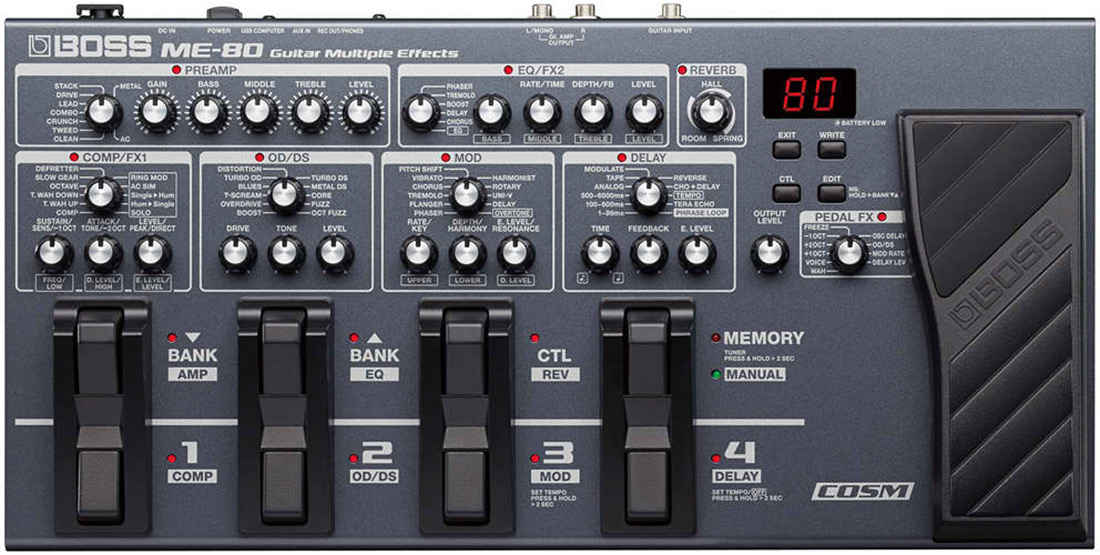 Не важно, в каком стиле вы работаете, вы всегда сможете создать свой уникальный звук с помощью огромного набора эффектов в ME-80. Законченная история сценических процессоров в ваших руках, от различных типов перегруза до эффектов вау, пространнственных эффектов и эффектов модуляции. Так же присутствуют эффекты, никогда и нигде не представленные еще, созданные с помощью новой технологией MDP, такие как Tera Echo и Overtone. Обновленные модели усилителей COSM включают новые модели как Crunch и Metal, плюс AC преамп, созданный специально для акустических гитар. Встроенная педаль экспрессии может быть использована для регулирования уровня громкости и эффектов, как вау, октавер, эффекта Freeze, так же для регулирования уровня эффектов, как дилей и т.д.