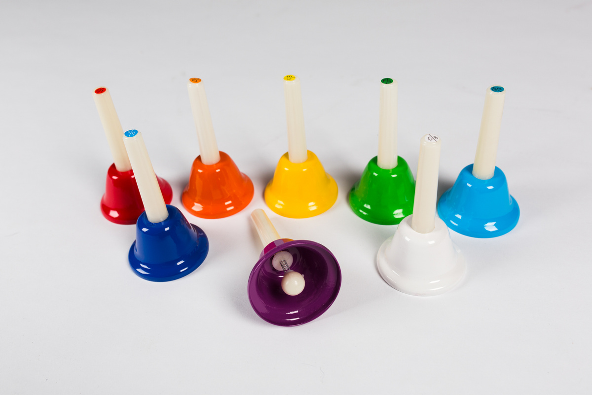 Колокольчик (НАБОР - 8 шт.), металлические на пластиковой ручке, разноцветные, 8 нот, размер 13,5*7 см. Прозрачная, пластиковая упаковка
