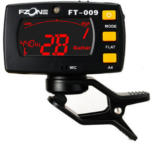 FZONE FT-009 - тюнер прищепка для гитары/баса, встроенные пъезодатчик и микрофон, ЖК дисплей (индикация в 2-х цветах: белый, зеленый).