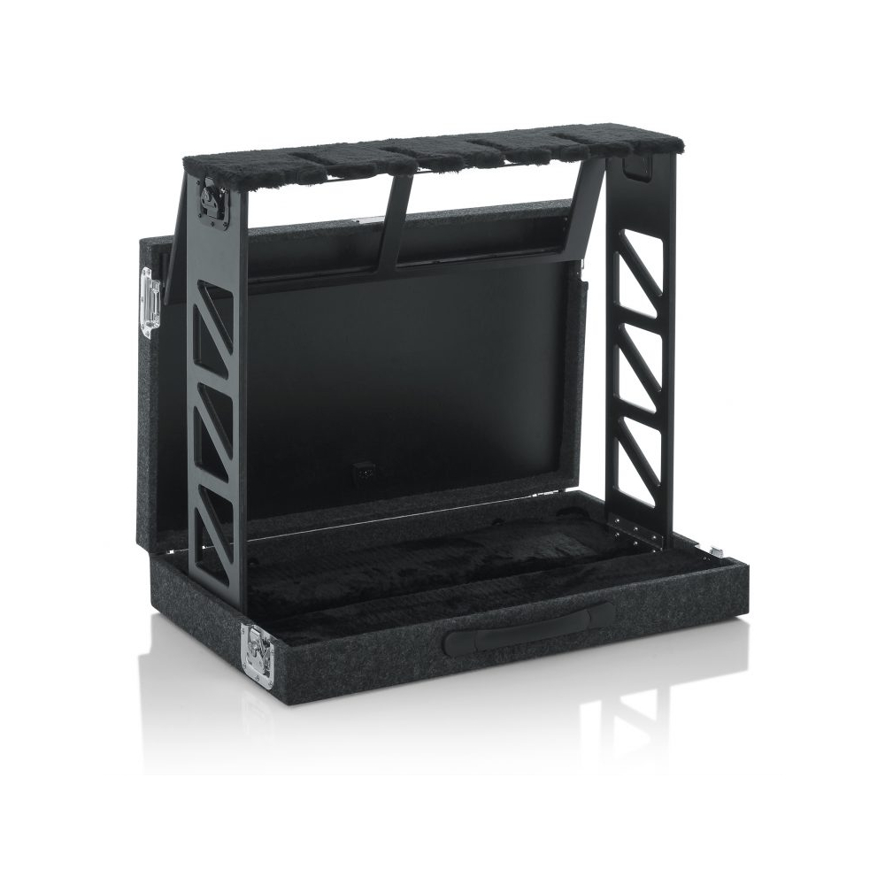 GATOR GTRSTD4 - Уникальная компактная стойка для четырех гитар , которая складывается в кейс. Подставка вмещает 4 электрические, акустические или басовые гитары.Секция подставки фиксируется с помощью утопленных поворотных защелок. Эластичные безопасные ленты препятствуют скольжению гитар при установке. Березовая конструкция с серым ковровым покрытием.