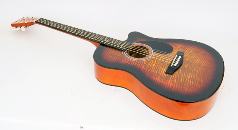 Фольковая 6-струнная гитара 38" с вырезом. Верхняя дека - ламинат, задняя дека и обечайки - ламинат, гриф - клен, накладка грифа - фанера, бридж - палисандр, колковая механика - хромированная, окантовка - пластик.