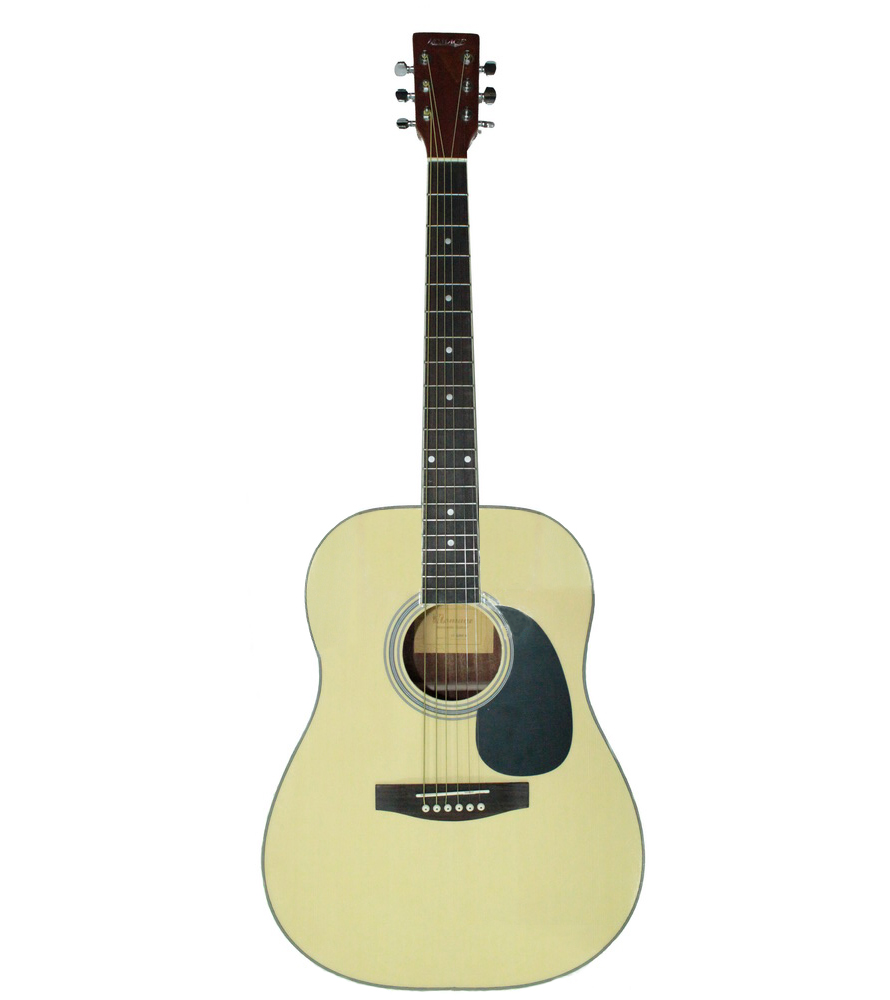 Акустическая 6-струнная гитара 41" без выреза. Верхняя дека - ламинат ели, задняя дека и обечайки - ламинат сапелле, гриф - эвкалипт, накладка грифа - палисандр, бридж - палисандр, колковая механика - хромированная, окантовка - 5-слойный кант, цвет - натуральный.