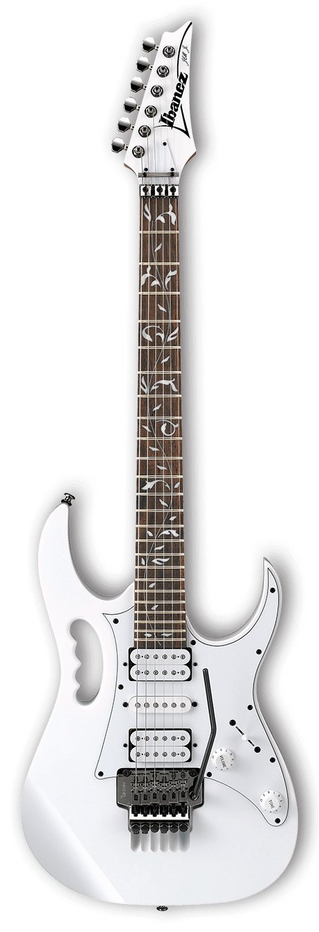 IBANEZ JEMJR-WH великолепная шестиструнная электрогитара, подписная модель знаменитого гитариста-виртуоза Стива Вая. Это инструмент, заключенный в потрясающе стильно выглядящий корпус белого цвета элегантной формы с оригинальным вырезом, который стал одной из характерных узнаваемых черт гитар линейки JEM. Пикгард и голова грифа также белые. От первого до последнего лада на гриф нанесена инкрустация в виде элегантного растительного узора Tree of Life. Фурнитура контрастная черная, а на голове грифа выделяется логотип Ibanez черного цвета. Корпус гитары сделан из красного дерева. Гриф удобной формы Wizard III кленовый. Мензура 648 миллиметров. Накладка из палисандра, радиус 400 мм. Звукосниматели два пассивных хамбакера с керамическими магнитами Quantum у грифа и у бриджа плюс пассивный сингл Quantum в средней позиции. Переключатель звукоснимателей пятипозиционный. Для настройки звучания предусмотрен один регулятор громкости и один регулятор тембра. На инструменте установлены струны толщиной .009 - .042.
